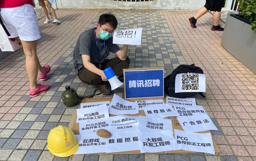 就连跟地摊八竿子打不着的一些互联网企业也跑来凑热闹。鹅厂的HR小哥哥居然把招聘开到了地摊,看这身装备,大喇叭、水壶、纸箱片,妥妥的专业地摊练家啊!