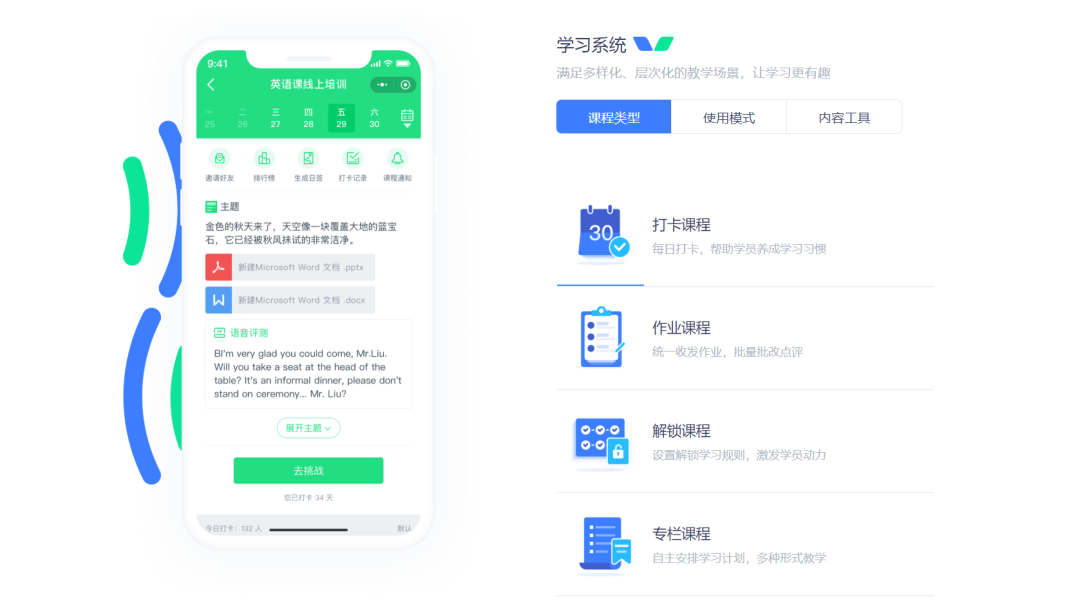 鲸打卡的工具包括学习系统、督学系统、营销系统、AI系统、直播系统这5大系统,是一款完整闭环、轻量级的学习产品。打卡督学功能很好的提高了学员完课率,做好续费和转介绍。
