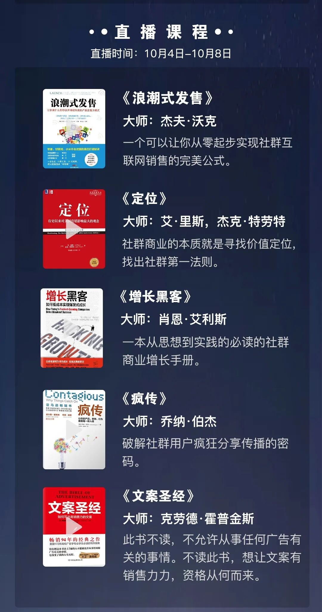 为了能够通过对这些国际大师作品的解读让我们在社群运营中的实操落地更进一步,我们联合一些专业的从事相应研究的意见领袖,利用国庆小长假,策划了本次为期5天的直播活动,